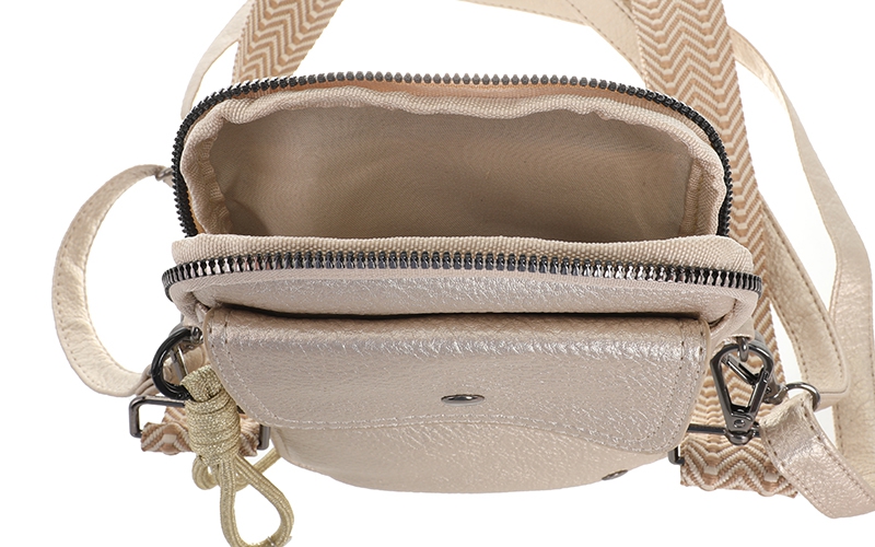 De voorzijde is voorzien van een extra vak met drukknopsluiting – handig voor spullen waar je snel bij moet. Binnenin vind je een hoofdvak met ritssluiting en genoeg ruimte voor je telefoon, sleutels, pasjes of andere essentials. De brede geweven schouderband geeft dit tasje nét dat beetje extra stijl, en is uiteraard verstelbaar voor optimaal draagcomfort.