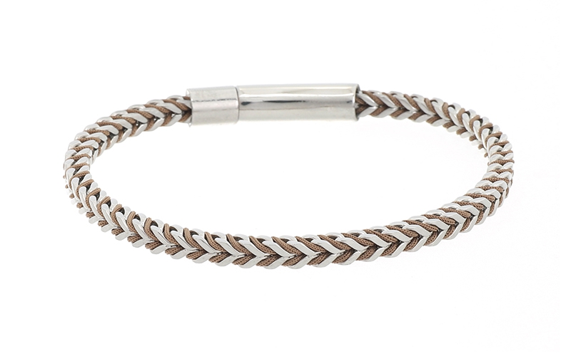 Deze armband heeft een uniek verweven metalen detail, waardoor hij direct opvalt zonder te overdrijven. De zilverkleurige afwerking geeft de armband een stijlvolle, robuuste uitstraling die past bij zowel casual als nette outfits.