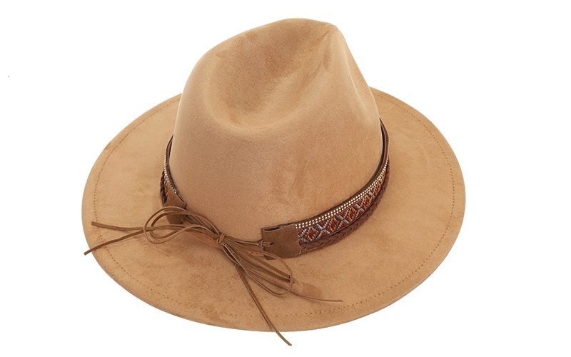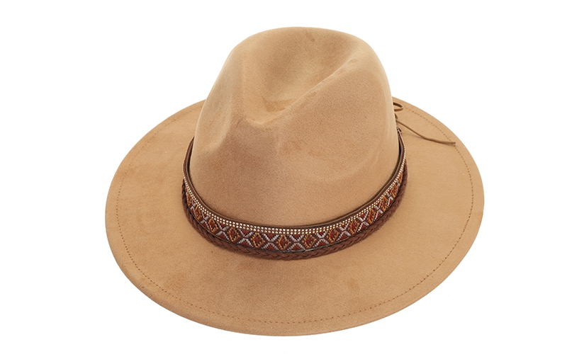 Unieke details: De decoratieve band met geweven geometrisch patroon, subtiele accenten en gevlochten koordjes geeft de hoed een sterke, verkoopbare boho-look.