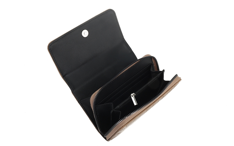 Veilige overslag portemonnee: De dubbele sluiting met drukmagneet en stevige rits geeft klanten een veilig gevoel bij het opbergen van pasjes en contant geld, wat de aankoopbereidheid direct verhoogt.