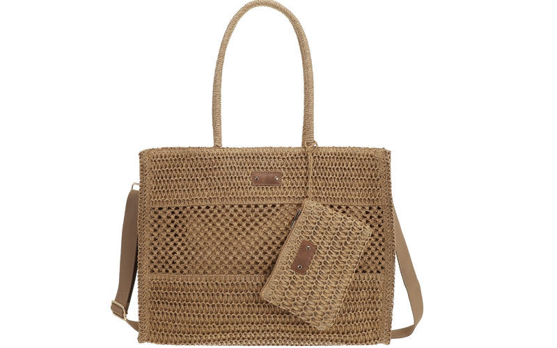 Zomerse blikvanger: Het geweven design en het brede rechthoekige silhouet van 45 cm geven de tas een populaire, strandklare uitstraling die een brede doelgroep aanspreekt.