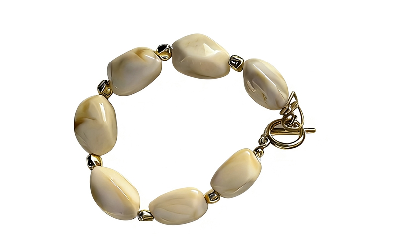 Karakteristiek design: De opvallende, gemarmerde stenen in combinatie met de goudkleurige tussenkralen geven deze damesarmband een unieke look die direct inspeelt op de aanhoudende chunky sieradentrend.