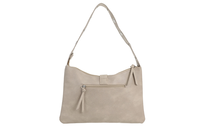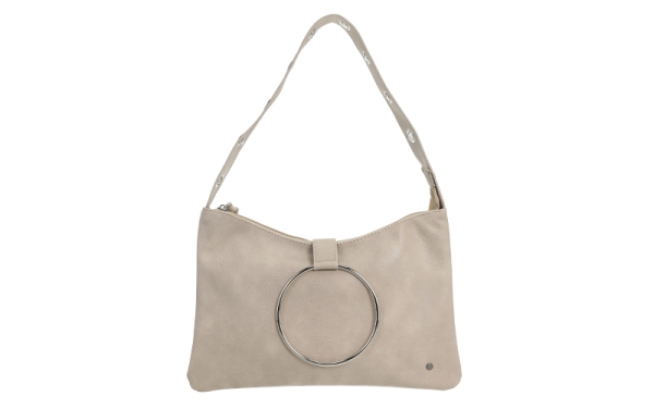 Opvallende details: De grote, zilverkleurige ring op de voorkant en de bijpassende schouderband met metalen zeilringen geven deze tas een stoere maar vrouwelijke look die direct de aandacht trekt.