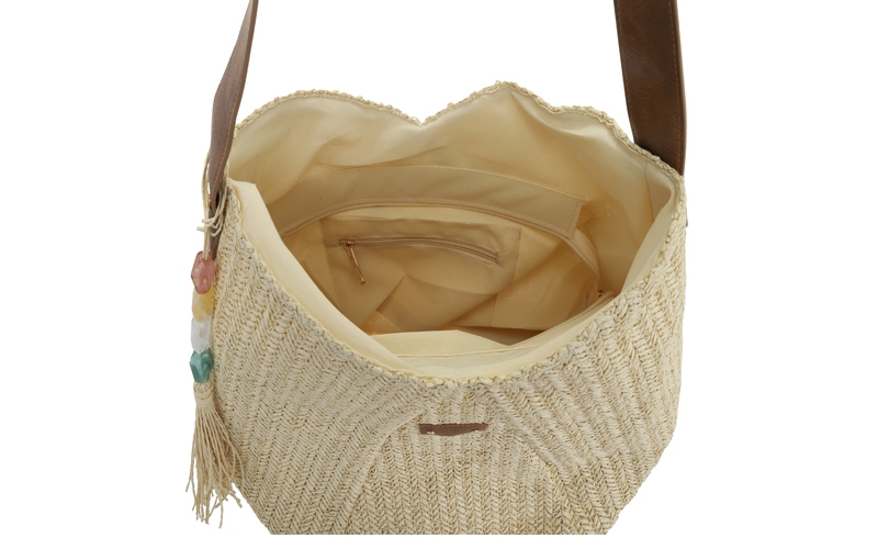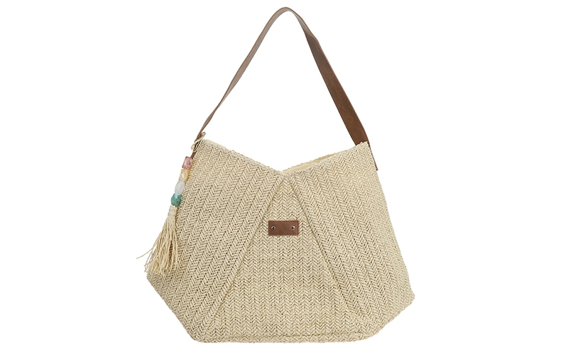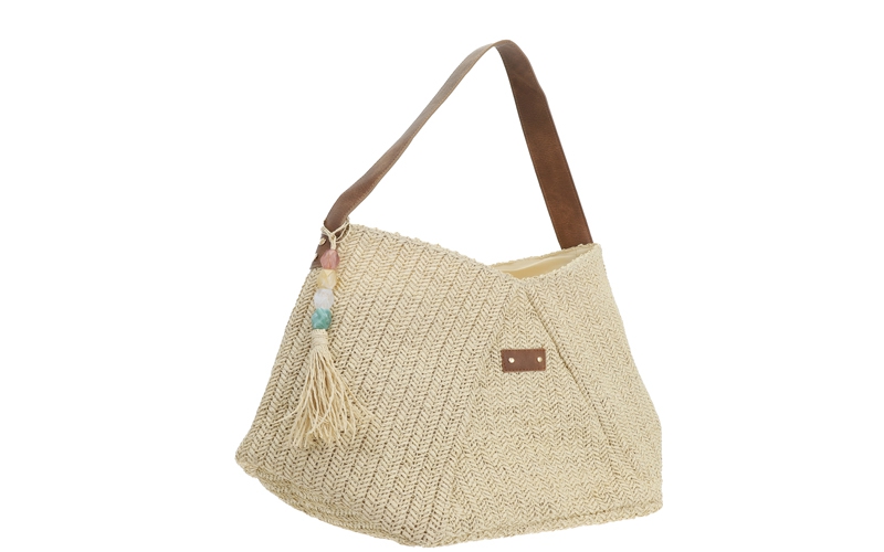 Zomerse blikvanger: Het luchtige, geweven zigzag-patroon en de bijpassende bagcharm met kleurrijke kraaltjes en een kwastje zorgen voor een zeer populaire vakantie-look.