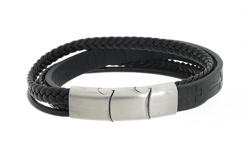 Het ontwerp bestaat uit meerdere banden die samenkomen in een elegante zilverkleurige stainless steel afwerking, wat zorgt voor een krachtige, gelaagde uitstraling. Dankzij het innovatieve verstelbare blokje in de sluiting kan de armband eenvoudig op maat worden gemaakt, waardoor hij perfect aansluit om vrijwel elke pols.