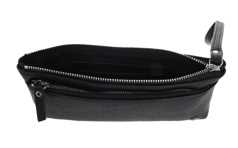 Indeling: Een ritsvak aan de voorkant en een hoofdvak met rits (inclusief 3 interne steekvakken voor pasjes). Aan de achterkant zit een uitschuifbare pasjeshouder met ruimte voor meerdere pasjes en een doorzichtig venster.