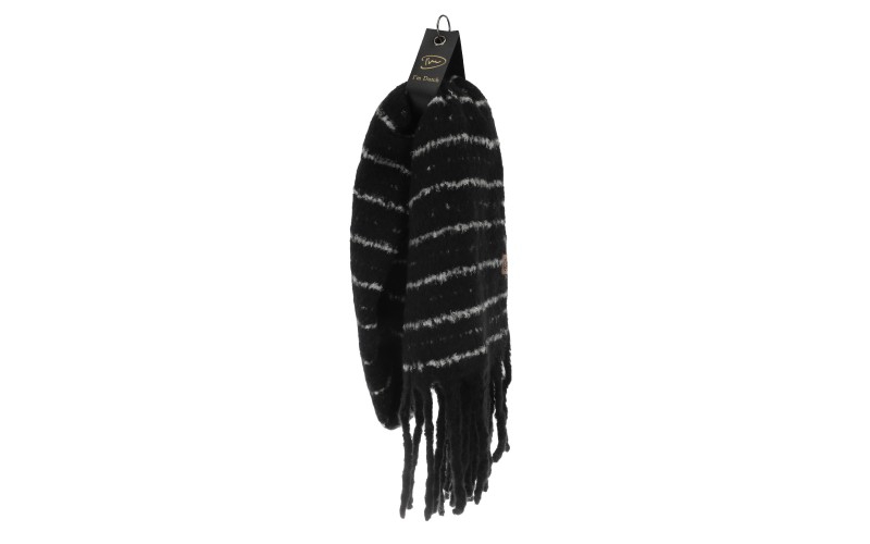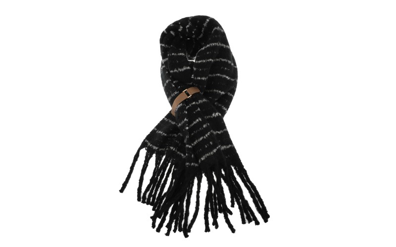Zacht en Grafisch Design: Het subtiele streeppatroon geeft de sjaal een levendige en interessante look, terwijl de dikke, robuuste franjes zorgen voor een speels en afgewerkt geheel.