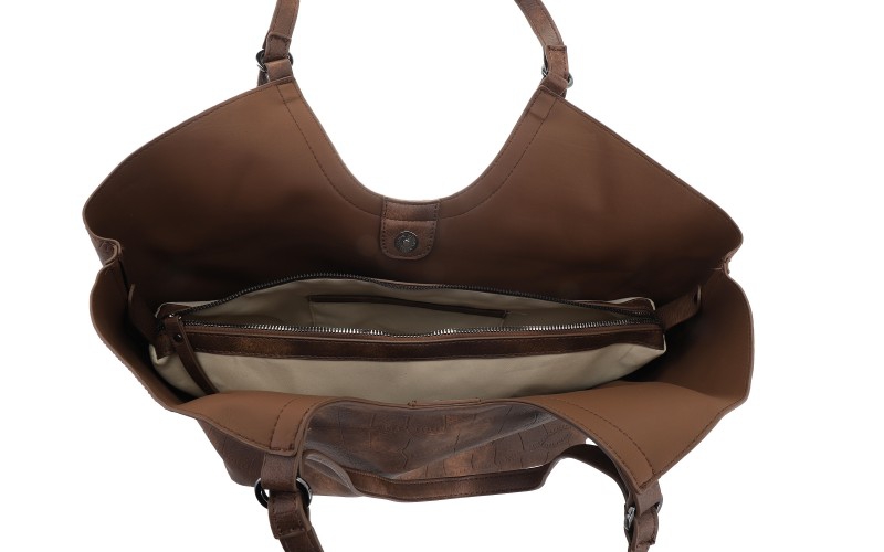 Binnenkant: 2 open vakken, 1 middenvak met rits (inclusief extra steek- en ritsvakje)