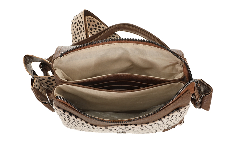 Onder de flap vind je een handig steekvak én een veilige ritssluiting. Die rits opent naar twee aparte vakken, zodat je je essentials overzichtelijk kunt opbergen. Aan de achterkant? Nog een extra ritsvak – perfect voor wat je graag snel bij de hand hebt.