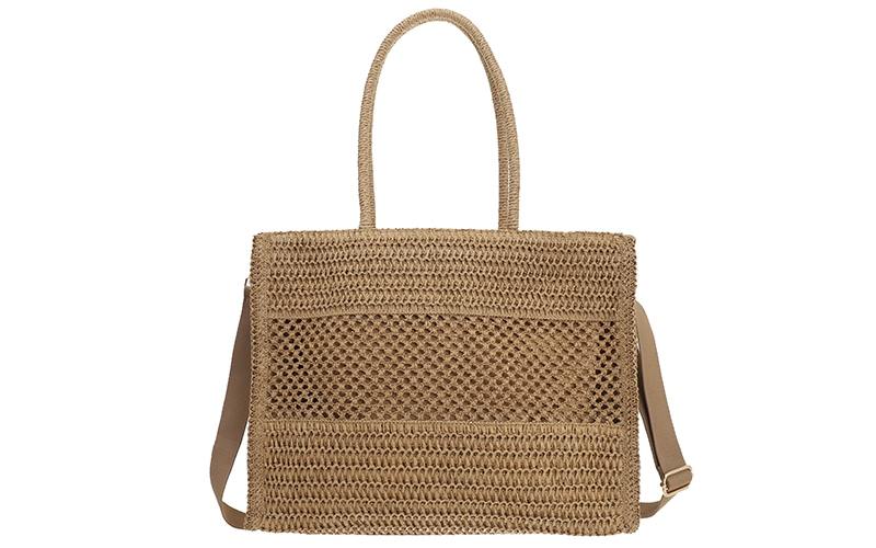 Zomerse blikvanger: Het geweven design en het brede rechthoekige silhouet van 45 cm geven de tas een populaire, strandklare uitstraling die een brede doelgroep aanspreekt.