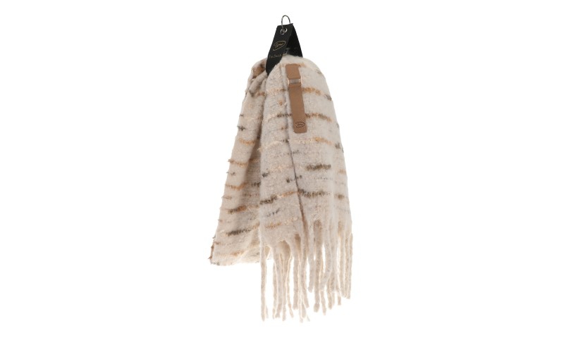 De Aafke is een sjaal die je omarmt met zijn volume en karakter. Het eerste wat opvalt, is de rijke, geborstelde textuur met het zachte, contrasterende streeppatroon. De dikke, ambachtelijke franjes geven het een robuuste en authentieke uitstraling, terwijl de stof zelf verrassend zacht en behaaglijk is.