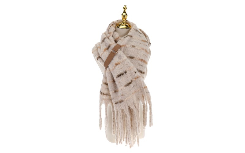 Zacht en Grafisch Design: Het subtiele streeppatroon geeft de sjaal een levendige en interessante look, terwijl de dikke, robuuste franjes zorgen voor een speels en afgewerkt geheel.