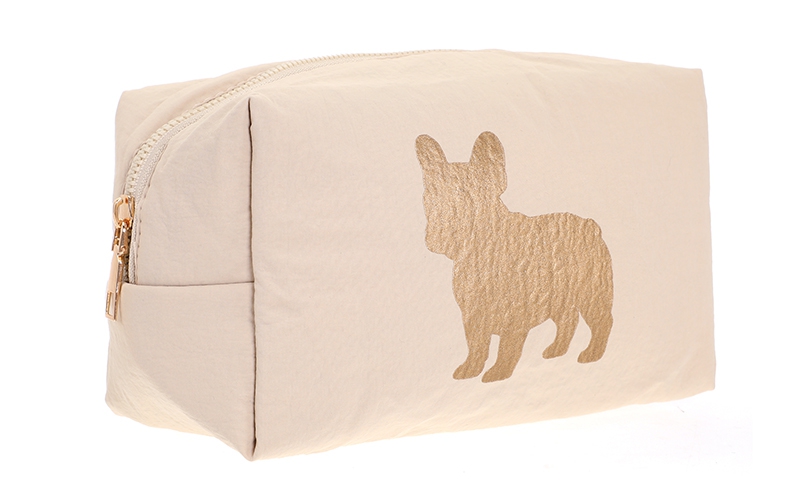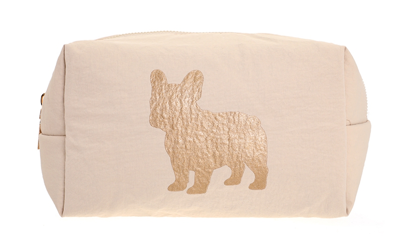 Maak kennis met Vernon, het tasje dat niet alleen praktisch is, maar ook een glimlach op je gezicht tovert. Dit model is ontworpen met diepte, waardoor het stevig op zichzelf staat en je makkelijk toegang hebt tot al je flesjes, tubes en andere toiletspullen. De gouden Franse bulldog-silhouet voegt een speels en herkenbaar accent toe.