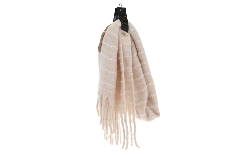 Zacht en Grafisch Design: Het subtiele streeppatroon geeft de sjaal een levendige en interessante look, terwijl de dikke, robuuste franjes zorgen voor een speels en afgewerkt geheel.