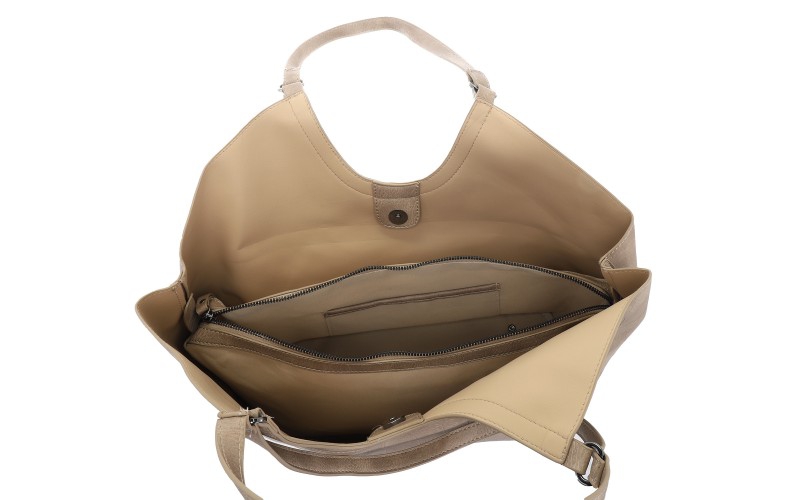 Binnenkant: 2 open vakken, 1 middenvak met rits (inclusief extra steek- en ritsvakje)