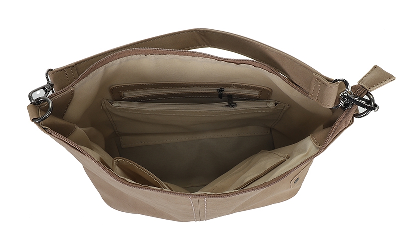 - Ruime Indeling met Veiligheid – Binnenin vind je een frisse streepjes voering en verschillende vakken, waaronder twee met rits, voor het veilig opbergen van je spullen.